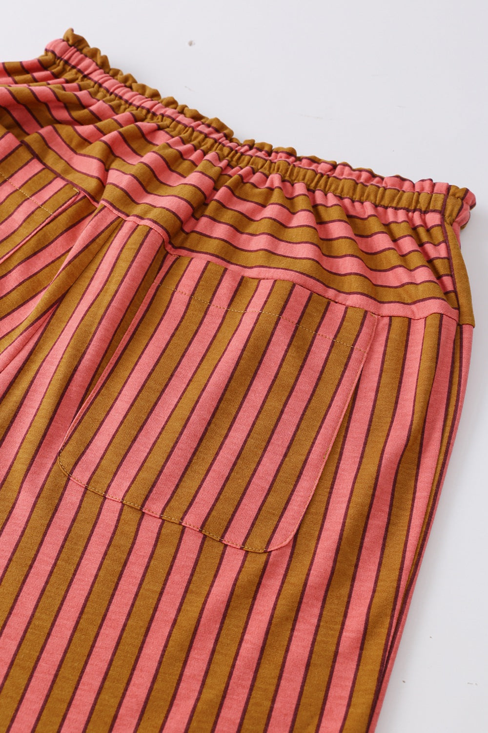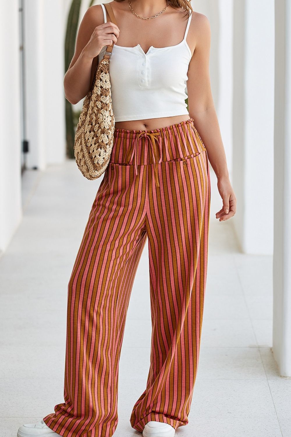 Stripe Button Pocket Tie Waist Casual Wide Leg Pants