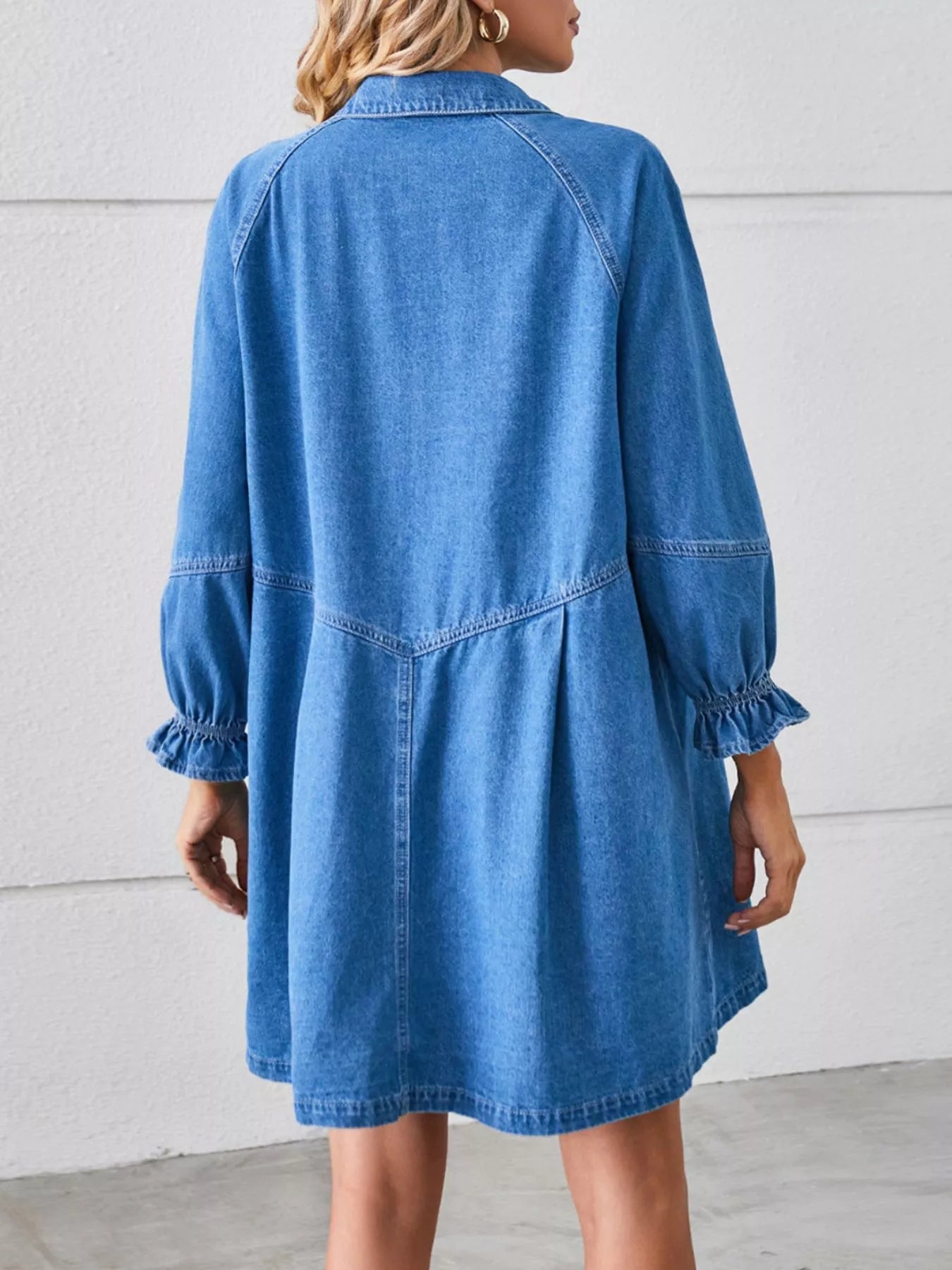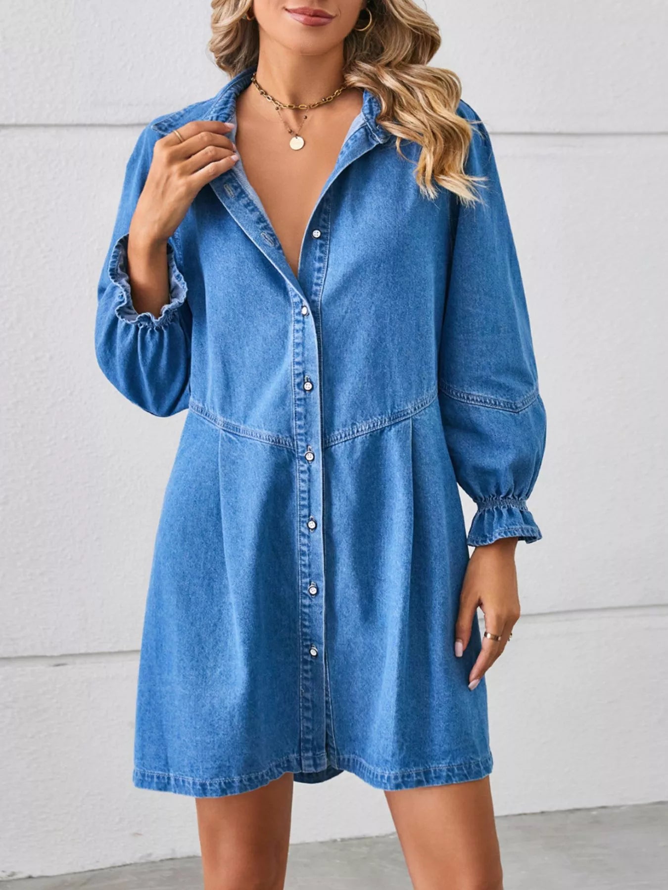 Button-Front Ruffle Cuff Denim Dress